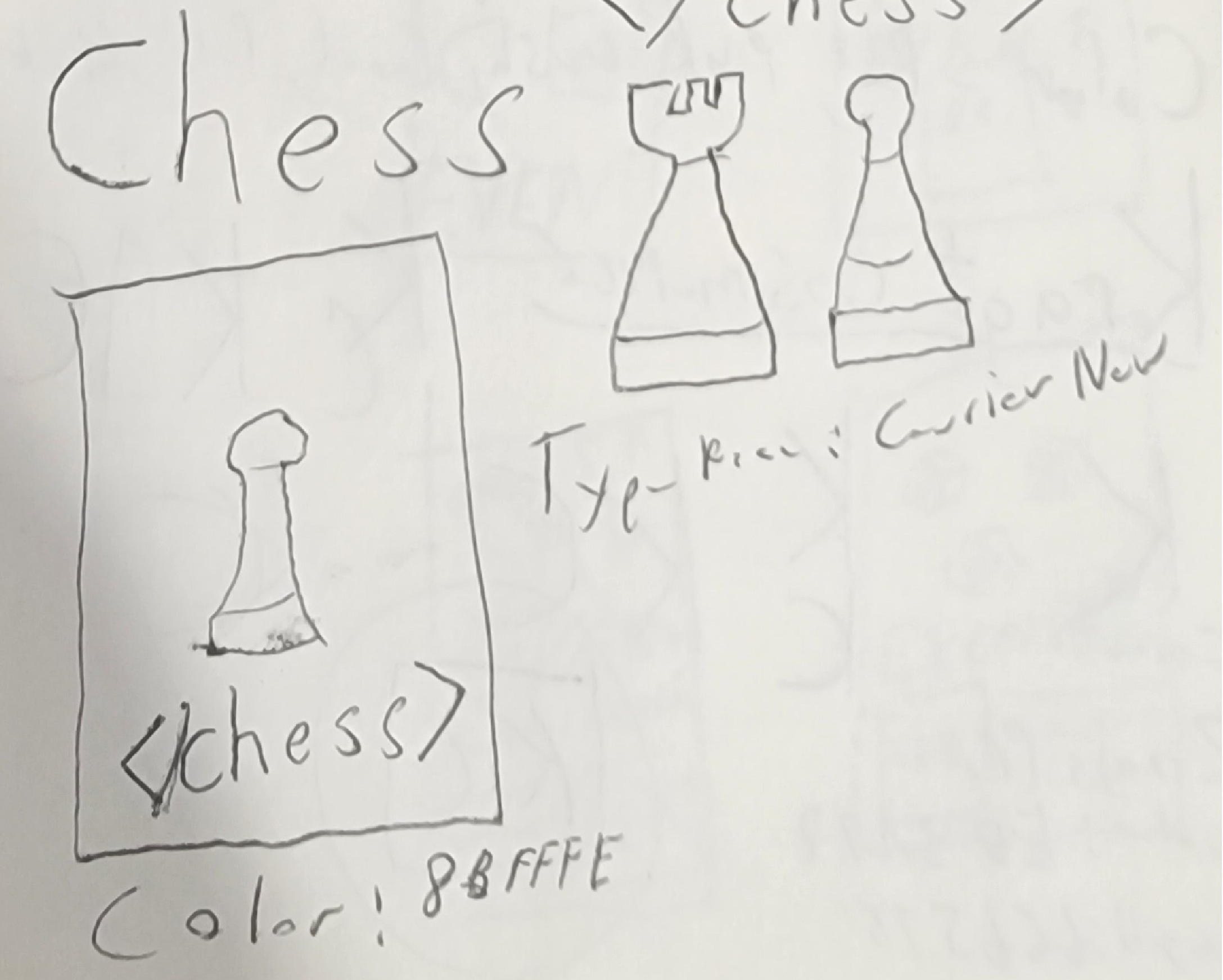 First I started out by making a list of what chess means to me. I came up with: Classic, Strategic, Complex, Classy, Games. From there it was time to sketch, I started with blocky letters and decided to go in a more minimalistic tech route with the angle brackets. To reference the sketches below I decided to use a pawn as that is one of the basic symbols of chess. Down to Earth, simple and entry level. Just like my time with programming and tech at the time of this project (February 2023). To maintain this theme I used the typeface Courier New, which is a monospaced slab serif font, much like a chess board's equal blocky spaces. I went with a light cyan color code: 8bfffe I wanted something calming, as chess can make me quite irate.