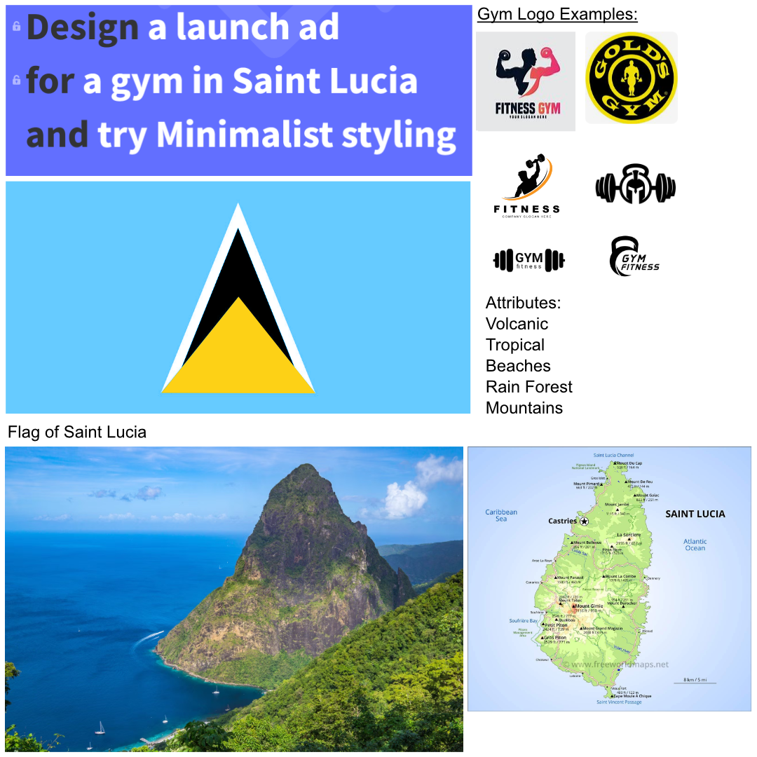 I finally did it, I completely ditched the Adobe suite of products, after I made this decision I figured it was the perfect opportunity to sharpen my skills. So I did what I have done for these challenges and pulled a prompt from Sharpen. The prompt I received was to design a launch ad for a gym in Saint Lucia and try Minimalist styling. I love minimalist styling so I knew this project would be fun. First and foremost I wanted to assemble a mood board, starting with minimalist gym logos for reference, some attributes, some shots of St. Lucia, and of course their flag.