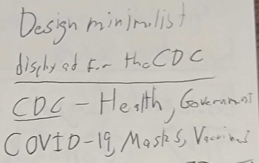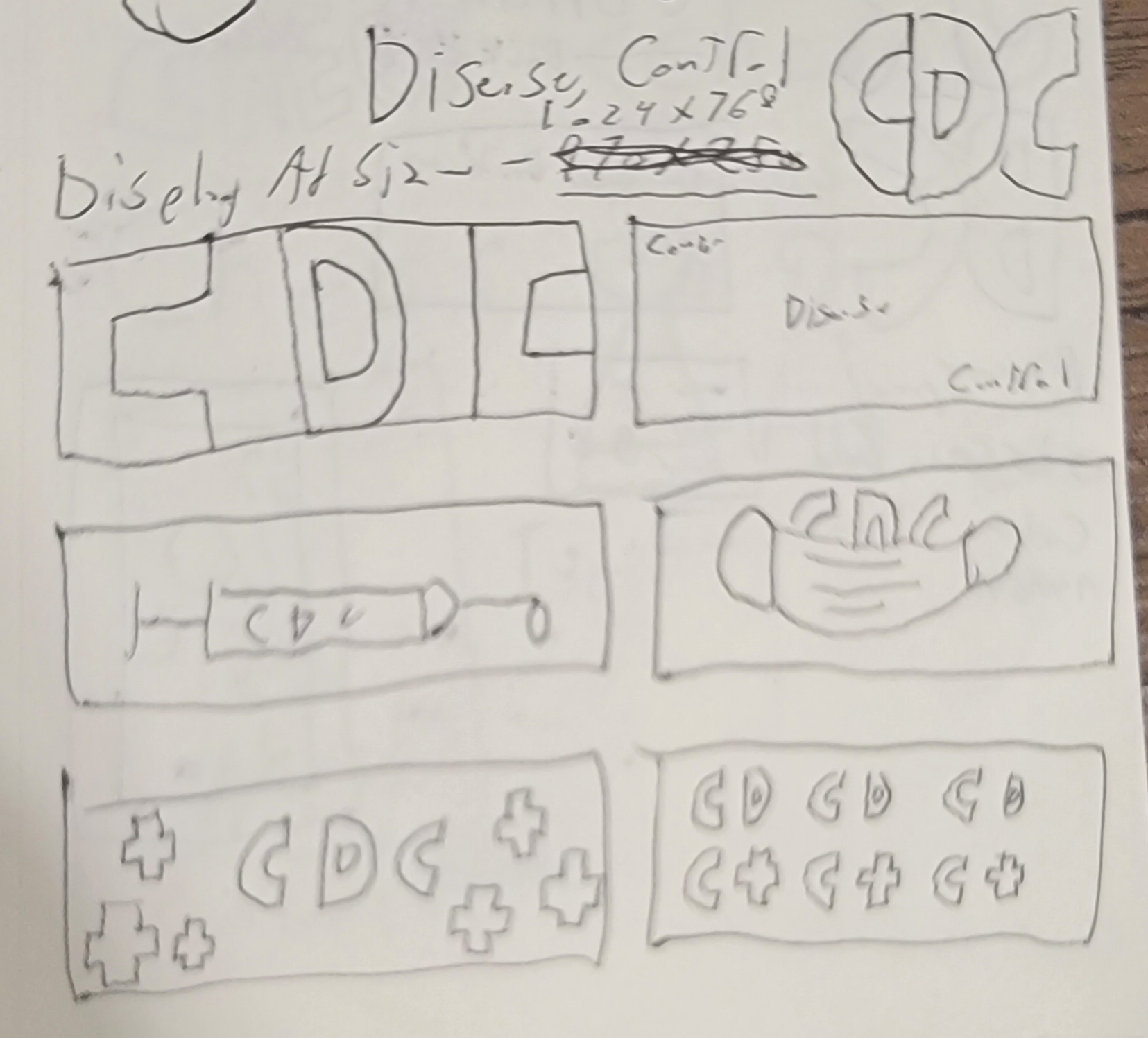 The process for this one was pretty straightforward. Keeping the minimalist design in mind I got to work creating some sketches. First I wanted to start with some attributes for the CDC: Heath, Government, COVID-19 response, Masks, and Vaccines. Deciding on a display ad size of 1024x768 I created some boxes to get sketching as you can see below. This phase really helped me settle on what imagery and symbols I would want to use in my final composition.
